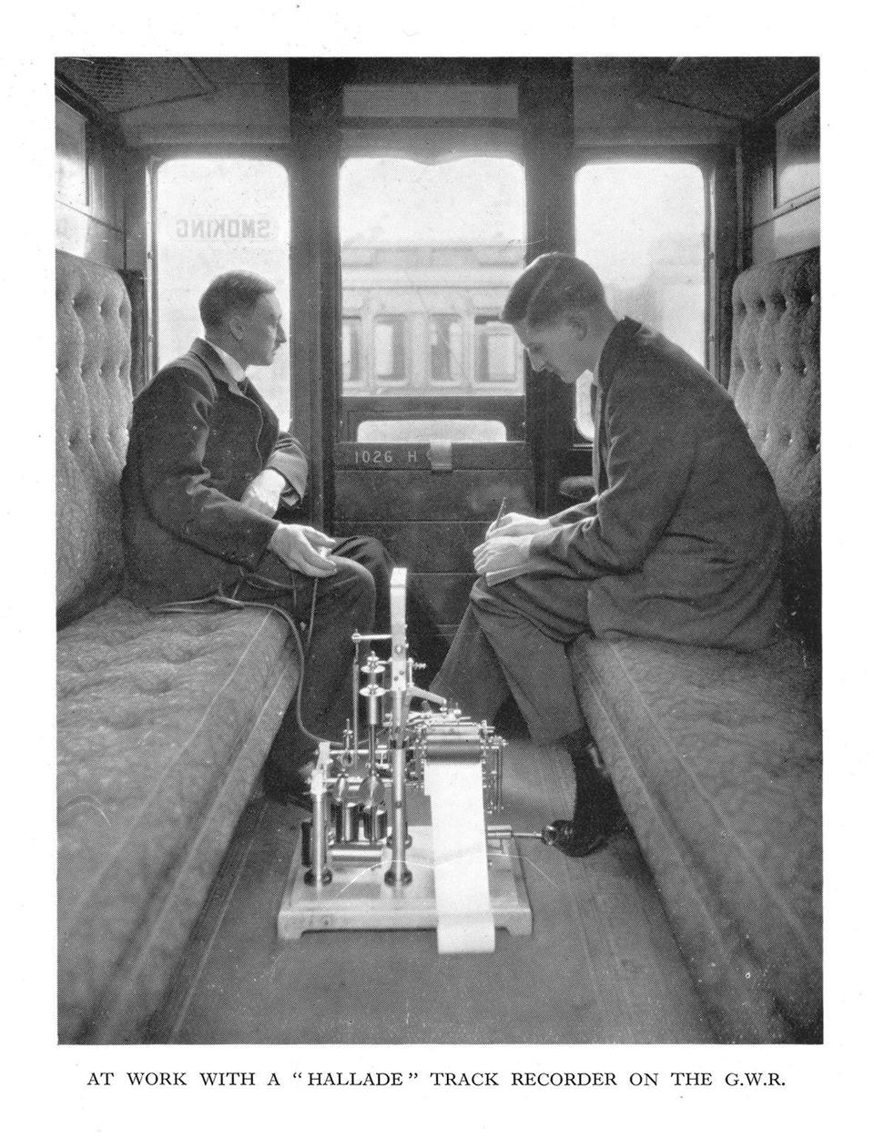 The photograph, clearly posed, represents the Hallade recorder in ordinary use. This required nothing more elaborate than a standard railway compartment - the rearmost in the penultimate carriage of the train was the preferred choice - and two staff, an operator and a spotter.