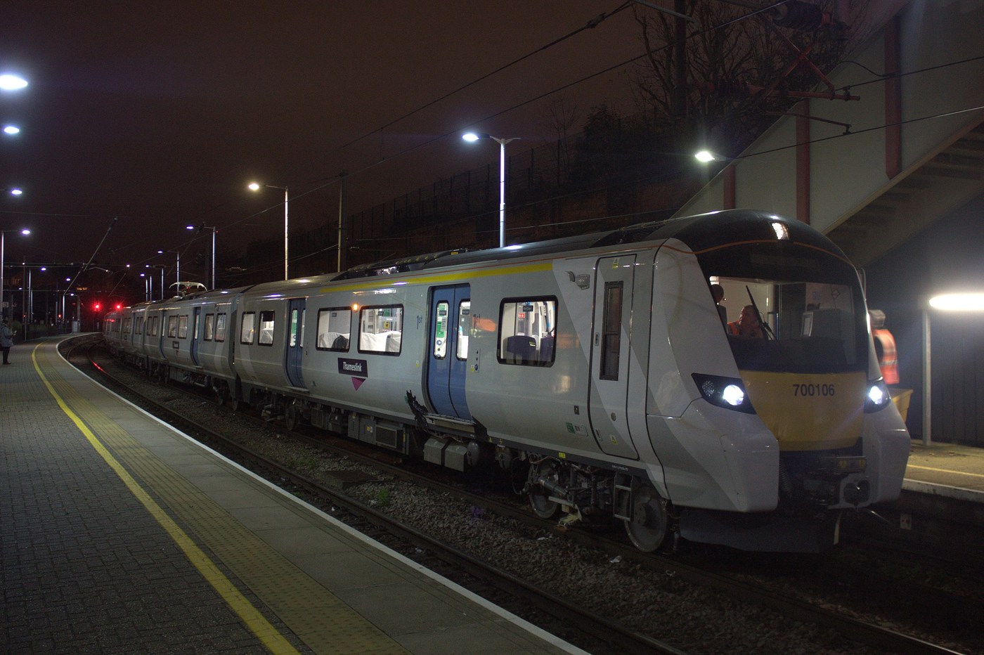 Siemens 700106 has begun AC testing on the Thameslink route. The 12-car electric multiple unit stables at Cricklewood, and carries out the tests at night. JULIAN GAJEWSKI supplied these images taken on December 1, as well as some taken of 700107 at Blackfriars the previous week.