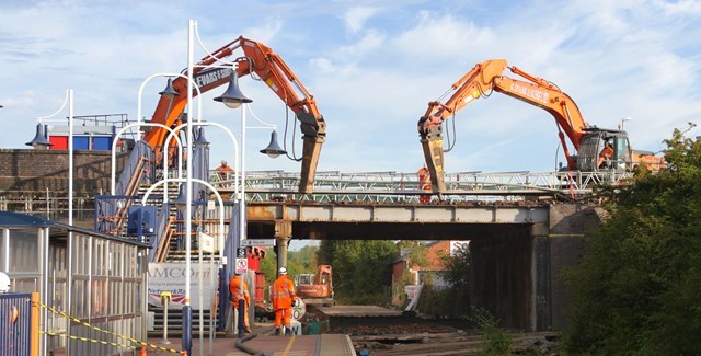 Over the bank holiday engineers worked a combined 2,000 hours at Station Road, demolishing and removing 550 tonnes of brickwork, installing 12 precast parapets and driving in the new bridge deck on two 300 tonne machines known as self-propelled modular transporters.