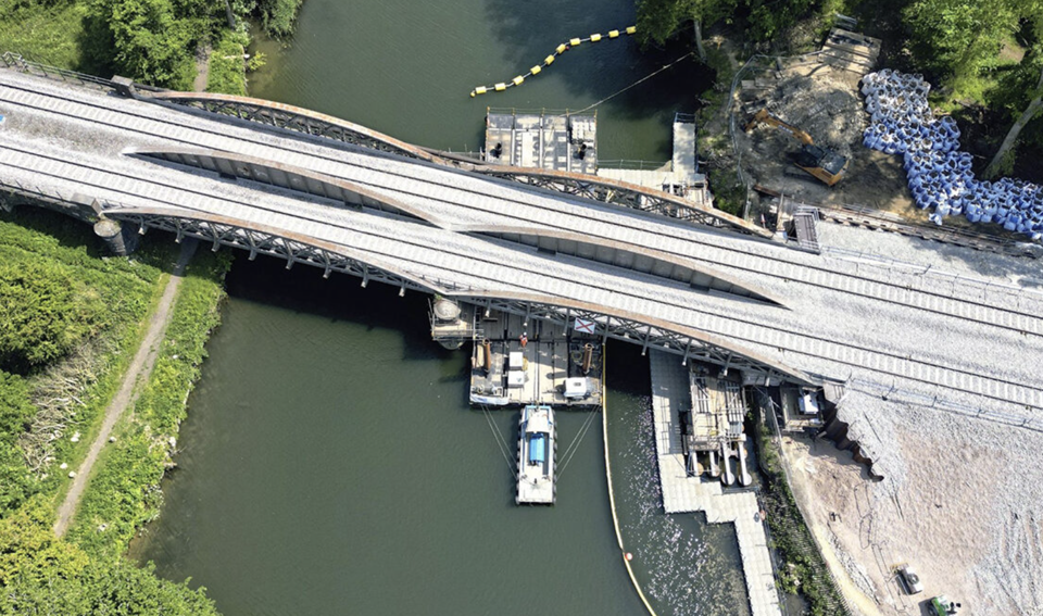 The bridge had been supported on temporary piles driven into the bed of the river Thames. This enabled the crumbling southern abutment to be demolished, along with a stretch of embankment. New structures were built, and in the final week of the closure the 150-tonne bridge was lowered onto the new structure and the tracks were re-laid.