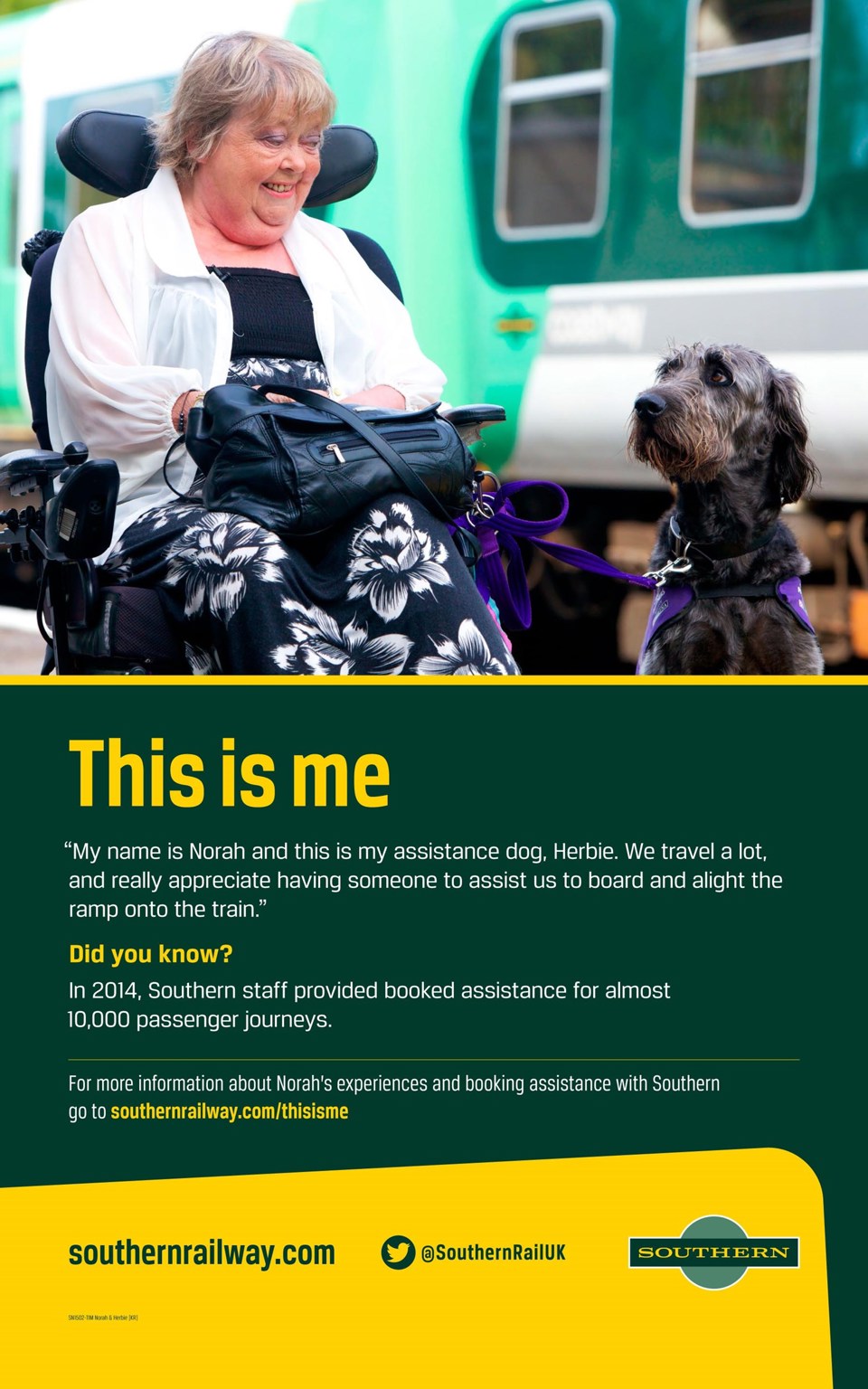 The 'This Is Me' campaign by Southern features a number of the operator’s disabled passengers talking about the assistance they receive when travelling and what this allows them to do. Their feedback has been put together on posters, leaflets and a webpage that includes further details, as well as a video of the individuals and their feedback on the service.