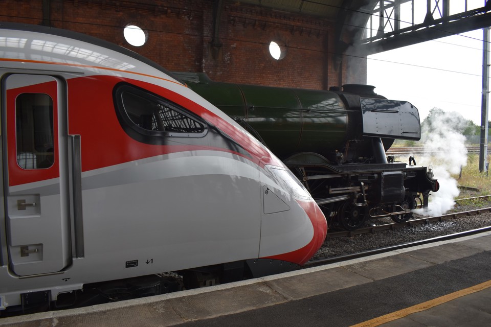 When the ‘800/1’ arrived at Darlington, it was met by ‘A3’ 4-6-2 60103 Flying Scotsman, as LNER sought to celebrate the railway’s past and future.