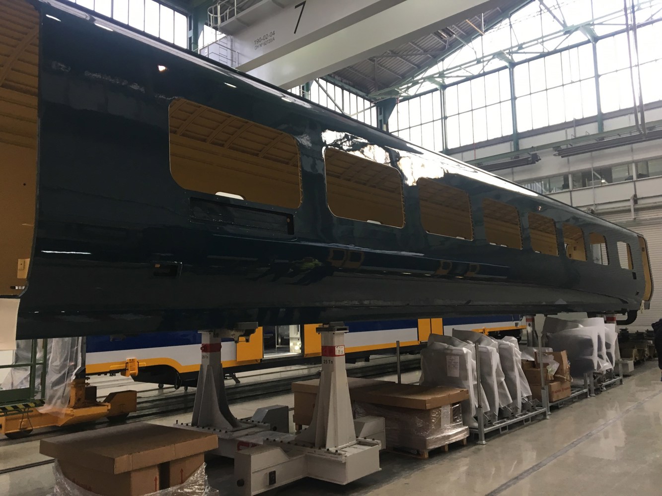 Seventy-five coaches are being built by Construcciones y Auxiliar de Ferrocarriles (CAF) in Beasain, northern Spain. As this issue of RAIL went to press on April 5, 22 bodyshells had been completed. The first five Mk 5s are due to move to the Velim test track in Czech Republic in July.