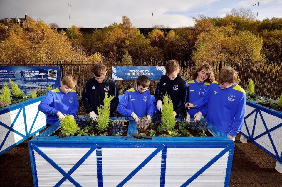 Pupils of the Everton Free School installed a ‘blue garden’ at the station as part of Everton’s pledge to make the area around Goodison Park ‘more blue’. This included three planters the pupils had designed and made. The football club donated three stadium seats so that passengers can sit in the garden area, and the school maintains both the planters and seats. An information panel was installed to explain the significance of the garden and the project.