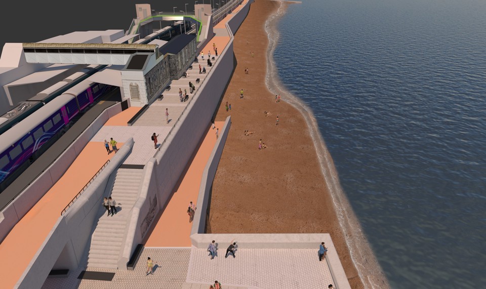Forming the next stage of the area’s resilience work, they include a taller sea wall with high-level promenade, new pedestrian access to the beach, and a new accessible footbridge for the station.