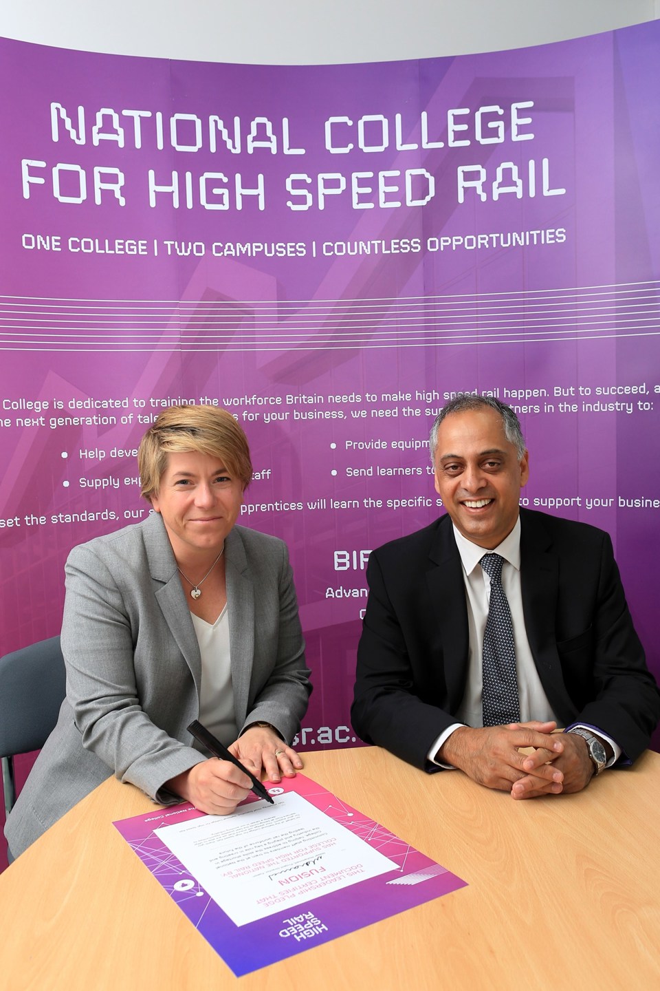 PICTURE: Fusion Project Director Nissar Mohammed signs up the joint venture’s apprentices to courses at the National College for High Speed Rail, with Chief Executive Clair Mowbray. NCHSR.