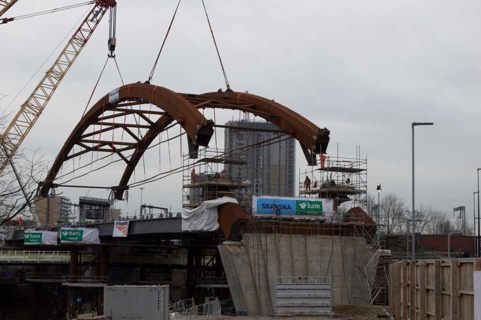 The 90-metre-long asymmetrical network arch was designed by Manchester-based architect BDP, and welded together on site from individual sections fabricated by Bolton company Severfield.