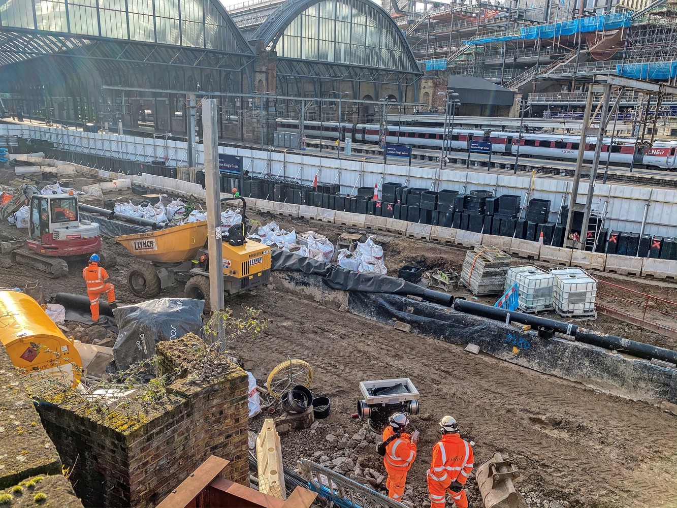 Platform 0 has been demolished and is being realigned to connect with the new six-track approach, with other platforms due to follow as part of an overall reduction in the number of platforms at King’s Cross from 12 to 11.