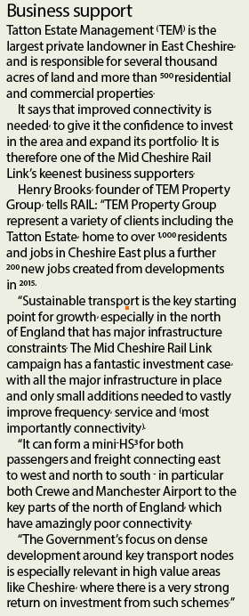 In November 2015 its name was shrewdly changed to the Mid Cheshire Rail Link, as part of a deliberate change of tack to widen its geographical scope. And in August this year a 40-page updated business case and consultancy report was published, to shore up the group’s already compelling arguments.