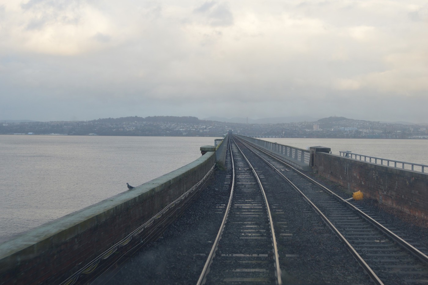 Halfway across Tay Bridge, the train stops. I’m not a fan of high bridges over water, and I’m not hugely enjoying being so exposed as we gingerly cross the bridge.