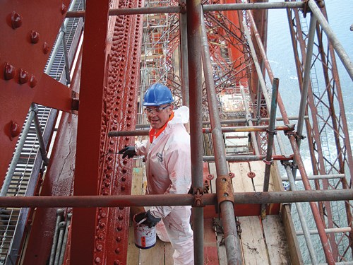 I am back on the bridge for the afternoon at 1400, and I’ll be applying the paint, if I’m lucky. Setting up equipment is OK, but time flies when you are spraying the first coat (stripe coat) with an industrial-sized paint blaster. The second layer is applied using a brush, but that isn’t half as much fun. It doesn’t make the job any easier but we wear giant gauntlet gloves because the pressure of the blaster is so strong that the rebound could rip your skin off. I stand on the scaffolding to do most of my work, but any difficult curves or complicated sections are painted by industrial abseilers.