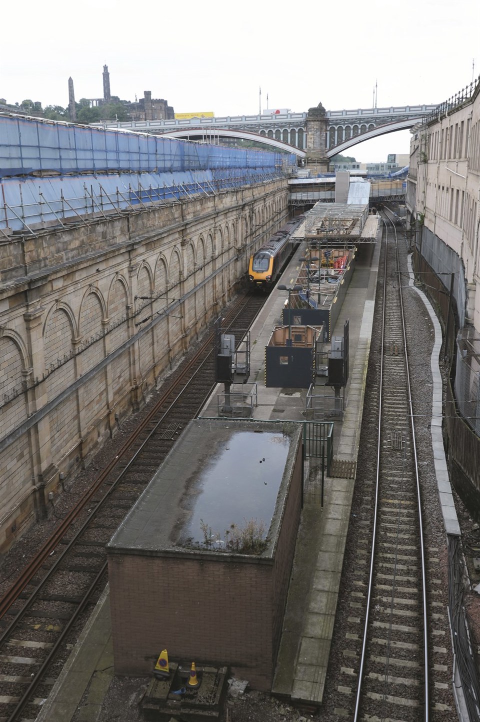 Now I know what it must have felt like under Ena Sharples’ hairnet! Waverley’s roof has vanished under masses of blue netting and scaffolding, leaving passengers to pick their way through the gloomy maze and clutter below, in a powerful example of the difficulties faced when builders and passengers have to co-exist.